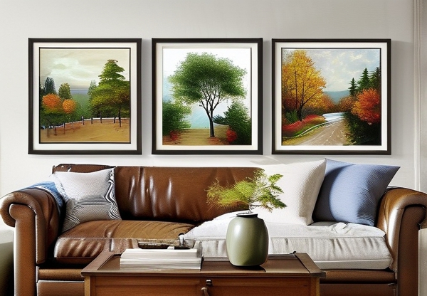 建议优先选择与主家具用色呼应的挂画,例如深棕色皮质沙发可搭配暖金色框亚麻画,浅灰色沙发则适合灰黑渐变背景的黑白摄影画。